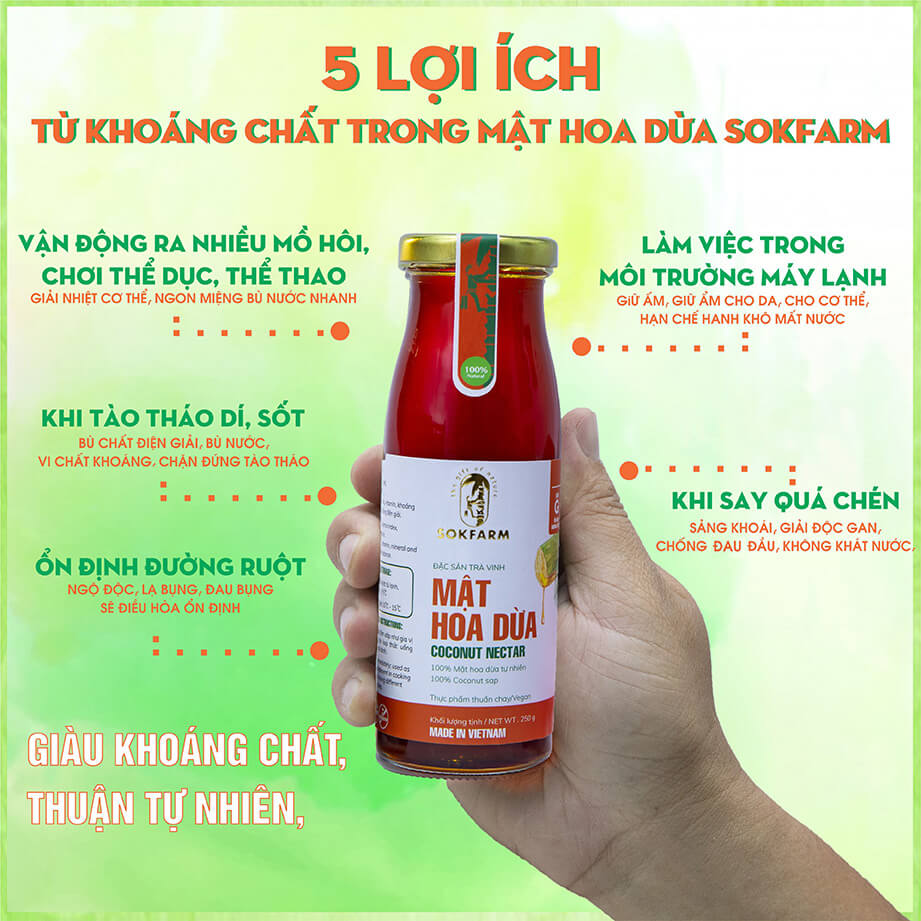 Mật hoa dừa giàu khoáng chất, viatmin và có hầu hết các loại acid amin được tìm thấy, các dưỡng chất này đều rất cần thiết cho cơ thể con người. Và đặc biệt sản phẩm có chỉ số đường huyết thấp và thuần thực vật.